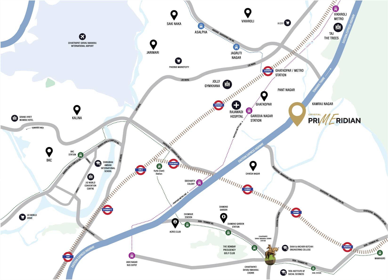 Crystal Primeridian stands at the precise point where Ghatkopar and Chembur converge - two of Mumbai's most desired neighbourhoods, each offering its own distinct advantages. On one side lies the vibrant, well-connected, cosmopolitan energy of Ghatkopar; on the other, calm residential character, a refined community vibe & cultural warmth of Chembur.